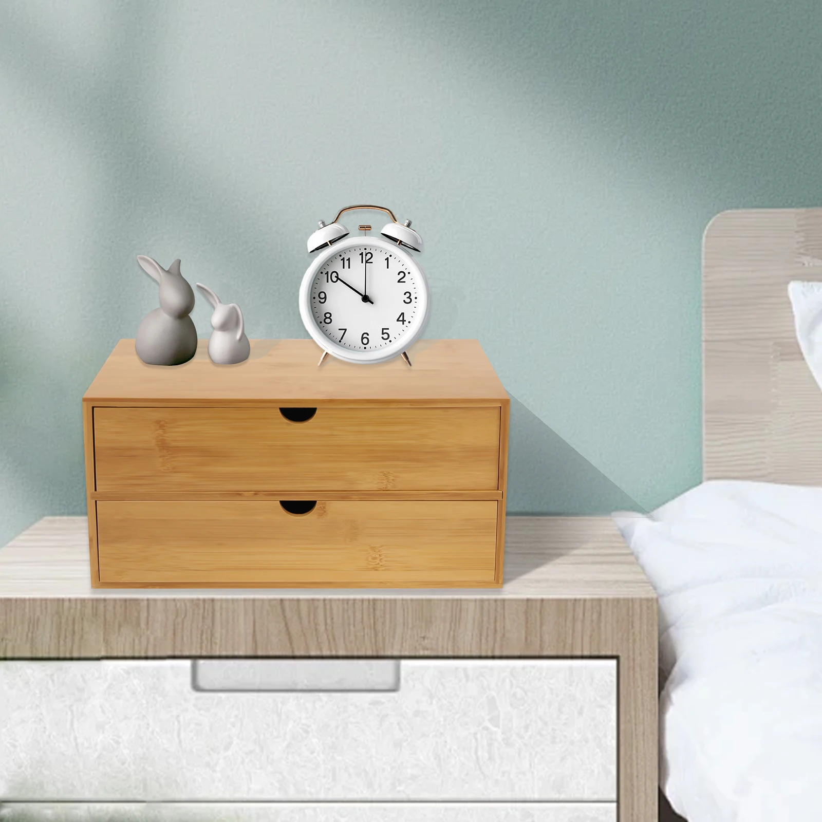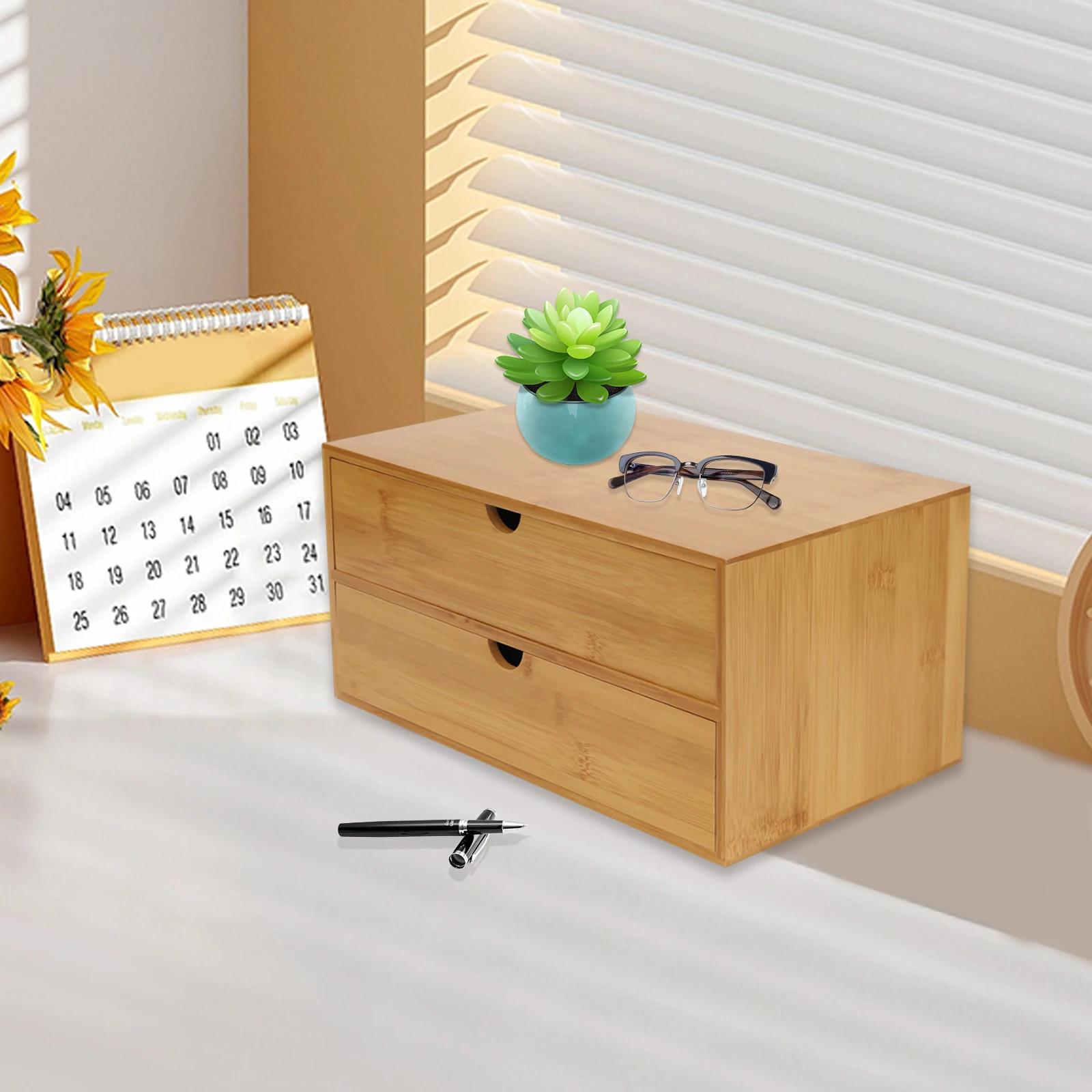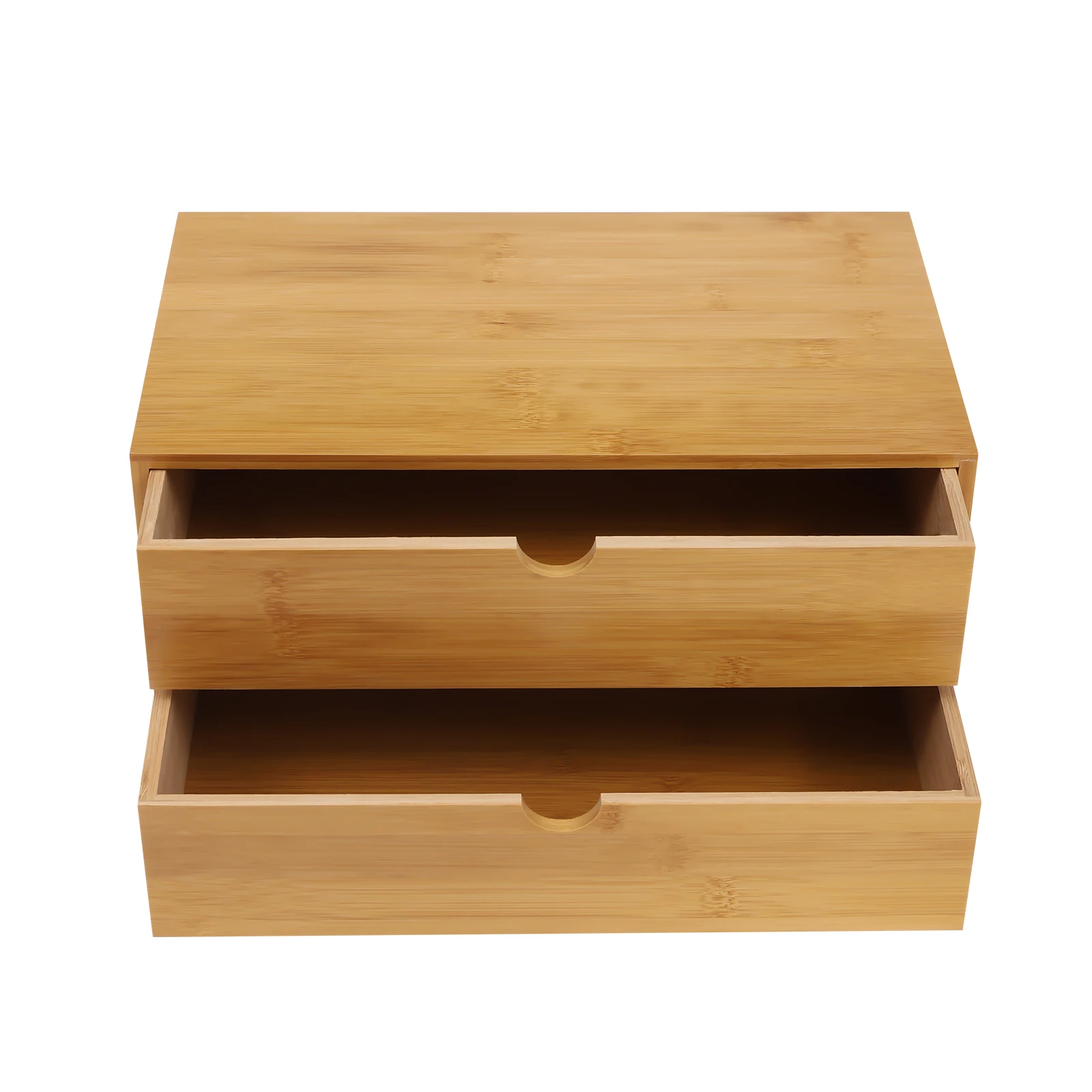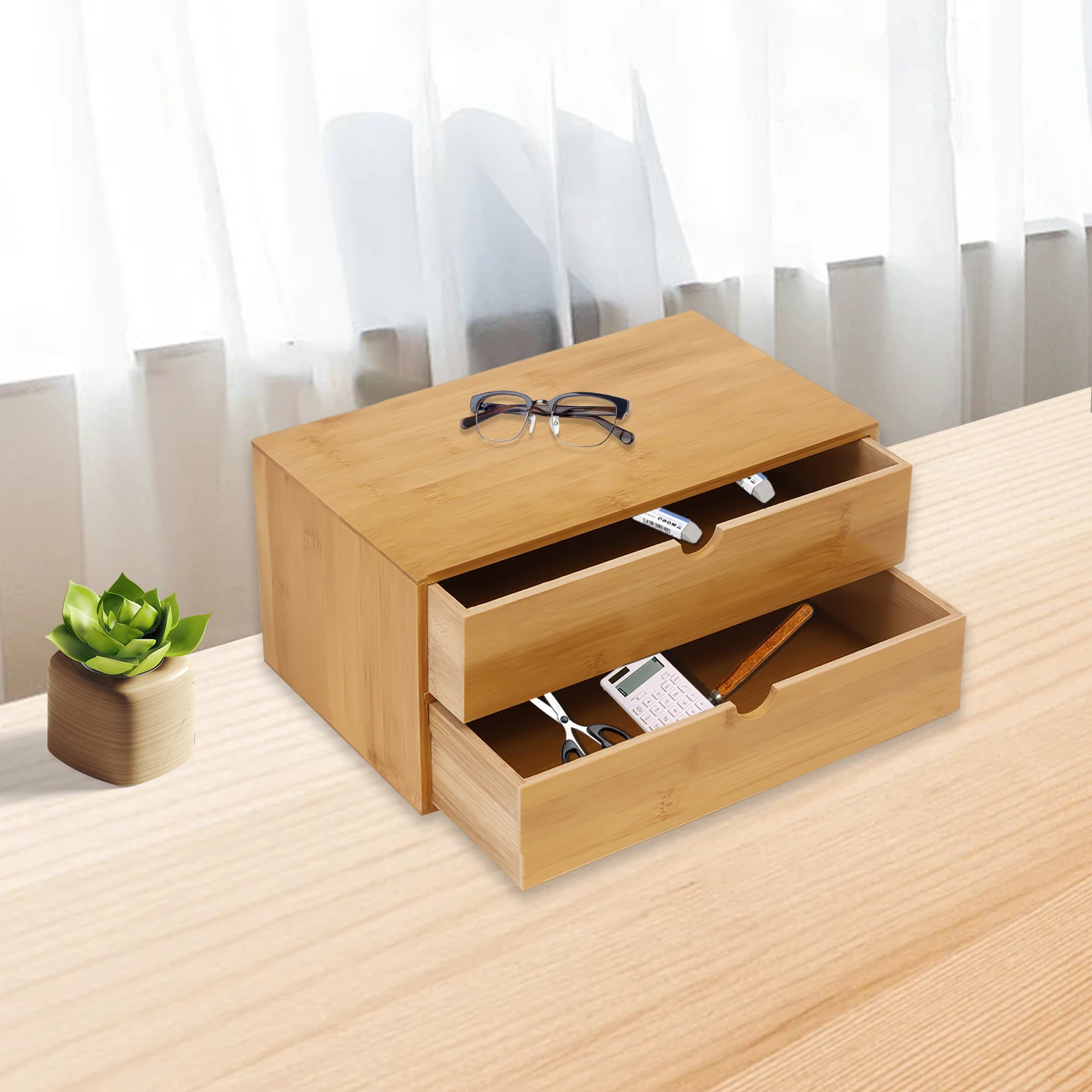 Bamboo Desktop Organizer - 2-Drawer Natural Wood Stationery & Makeup Storage