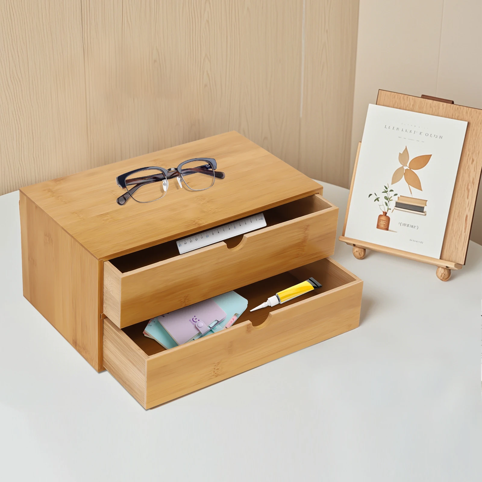 Bamboo Desktop Organizer with 2 Drawers, Natural Wood Desk Storage Tray for Office Home, Minimalist Style
