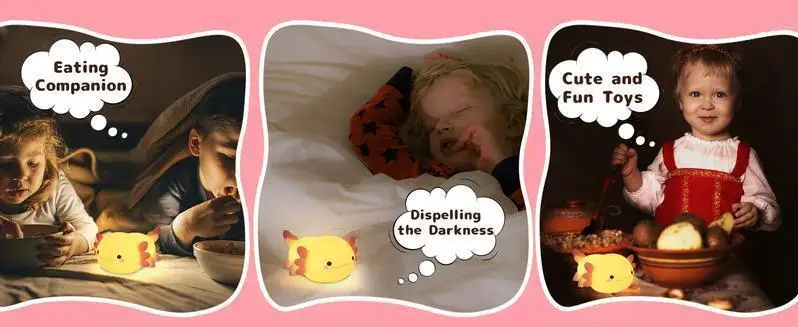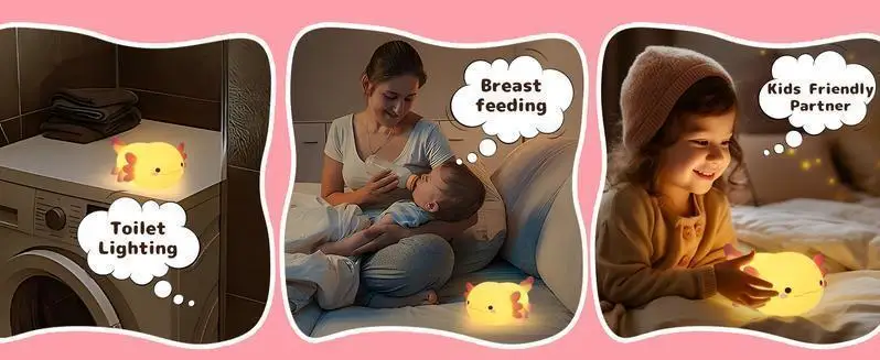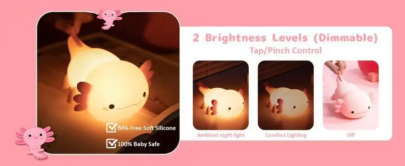 Safe and Soft Silicone Night Light:Creative Cute Axolotl LED Night Light is as soft as a cake. Rigorously tested for safety, each baby night light for kids' room meets RoHS and CE standards.