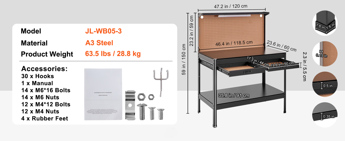 • Stable Solid Wood Construction: Crafted from heavy-duty carbon steel and featuring a solid wood work surface and multiple crossbeams, our workbench offers a stable structure. Say goodbye to wobbling and distractions and work with confidence.